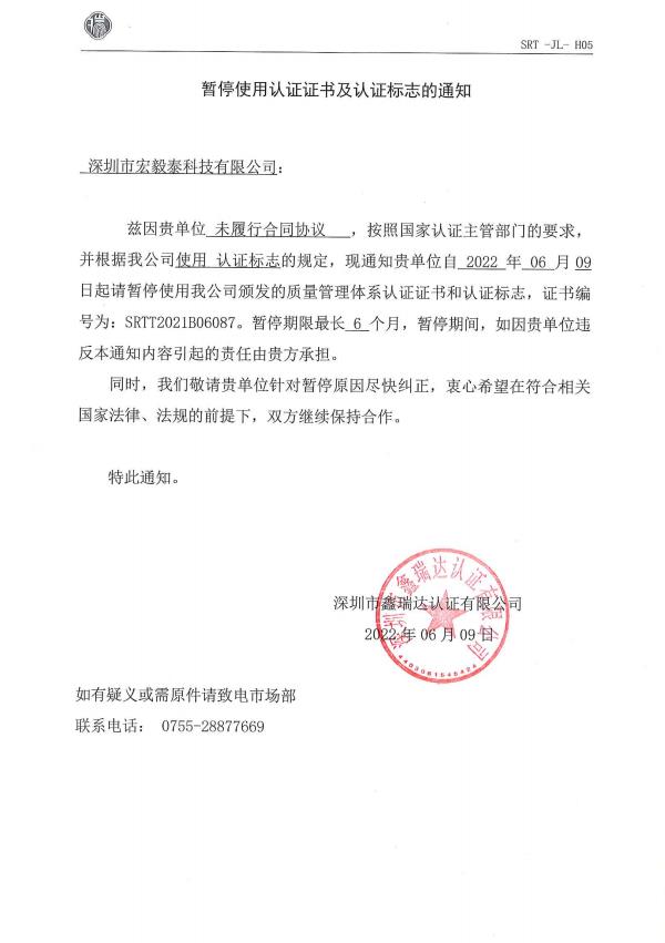 宏毅泰06月09號暫停通知書